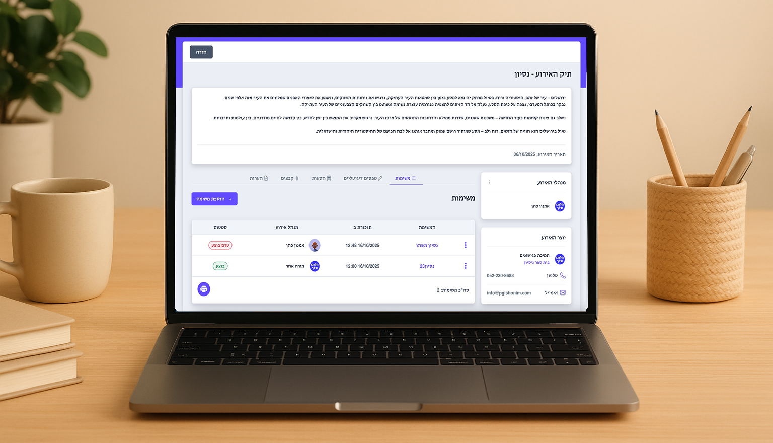 מערכת תיק אירוע מאפשרת ניהול מלא של אירועים בבית הספר, תיעוד כל שלב, מעקב אחר משימות, תזכורות אוטומטיות, שיתוף פעולה בין צוותים, דיווח בזמן אמת וגם שיבוץ לאוטובוסים. המערכת מותאמת לתיק הטיול של משרד החינוך ומבטיחה שכל אירוע ינוהל בצורה מקצועית, מסודרת ושקופה.