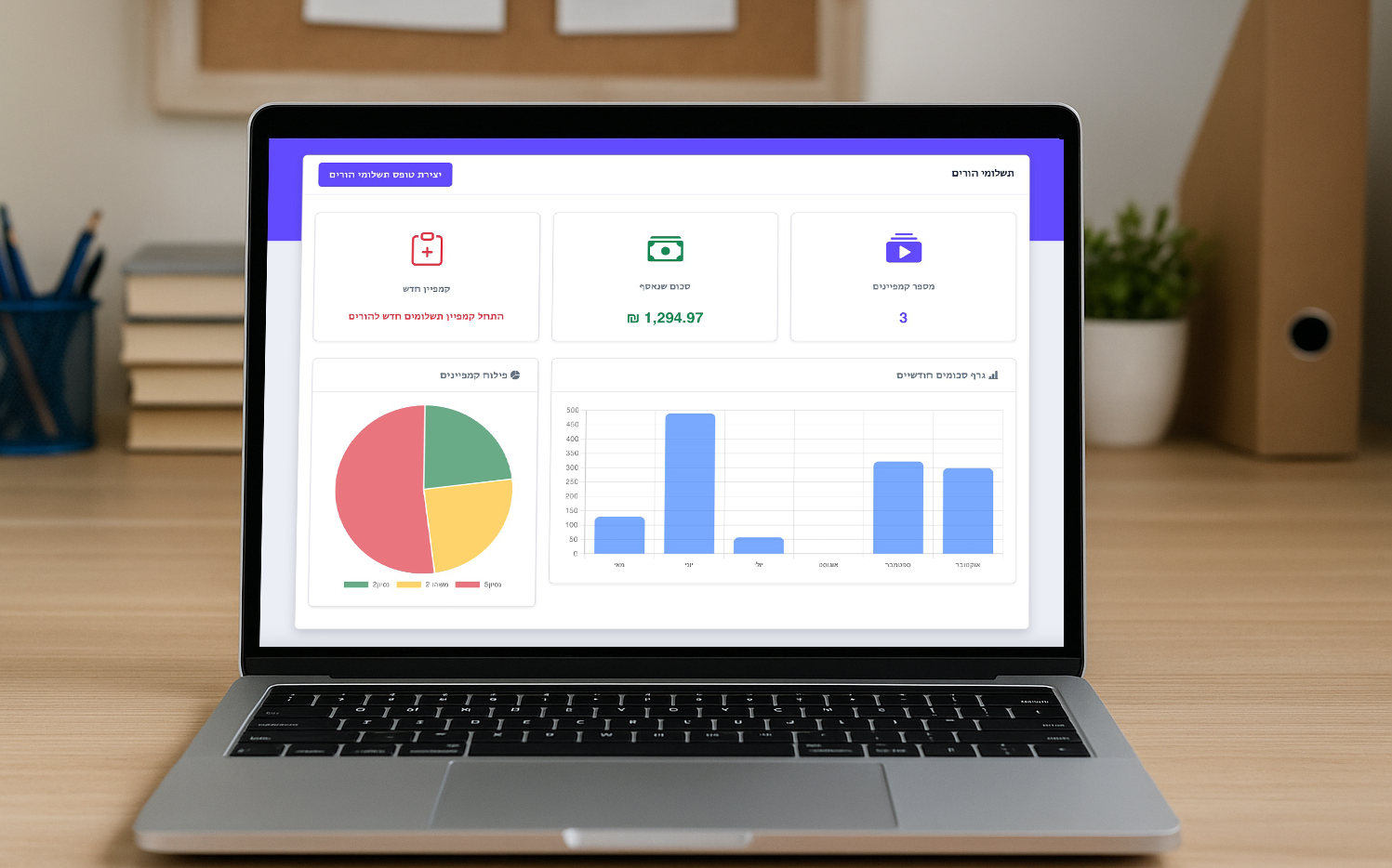 מערכת מתקדמת המאפשרת לבית הספר לנהל גביית תשלומים מההורים בצורה אוטומטית, לשלוח התראות, להפיק דוחות ואישורים, ולבצע סליקה מאובטחת. כל התהליך פשוט, יעיל ושקוף להנהלה ולהורים. המערכת חוסכת זמן יקר לצוות, מונעת טעויות, ומספקת להורים חוויית תשלום נוחה ובטוחה.